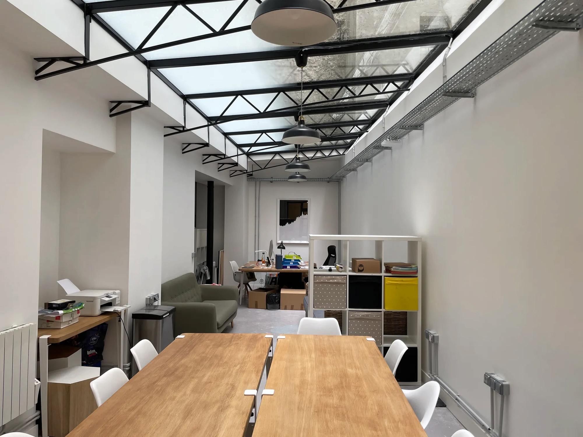 Dans une jolie cour fleurie, découvrez un espace de 60 postes de travail, 3 salles de réunion, ainsi que des espaces détentes, une cuisine et une douche.